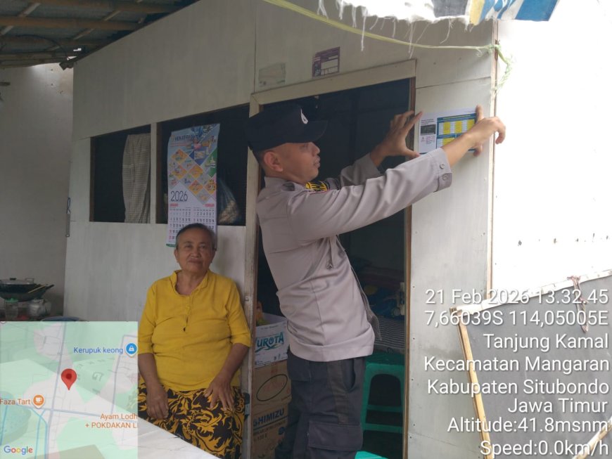 Situbondo – Dalam rangka mendukung program pemerintah di bidang pengentasan kemiskinan, Bhabinkamtibmas Desa Tanjung Kamal dari Polsek Mangaran melaksanakan kegiatan Door to Door System (DDS), Sabtu (21/2/2026) pukul 13.30 WIB hingga selesai.